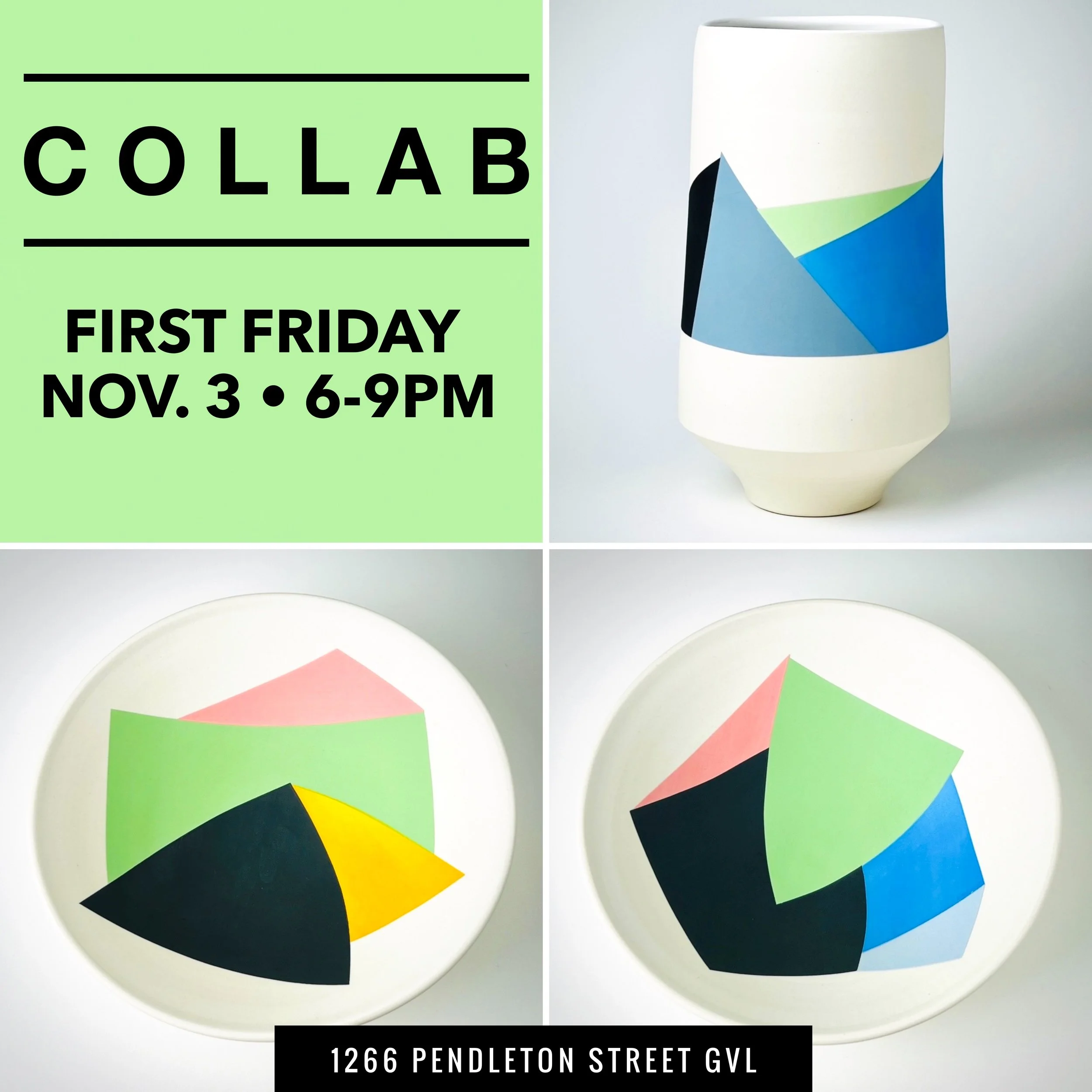 November First Friday features COLLAB. A show of collaborative ceramics created by Greenville artists Jeffrey Leder and Darin Gehrke. The show will take over the gallery until November 10, 2023.