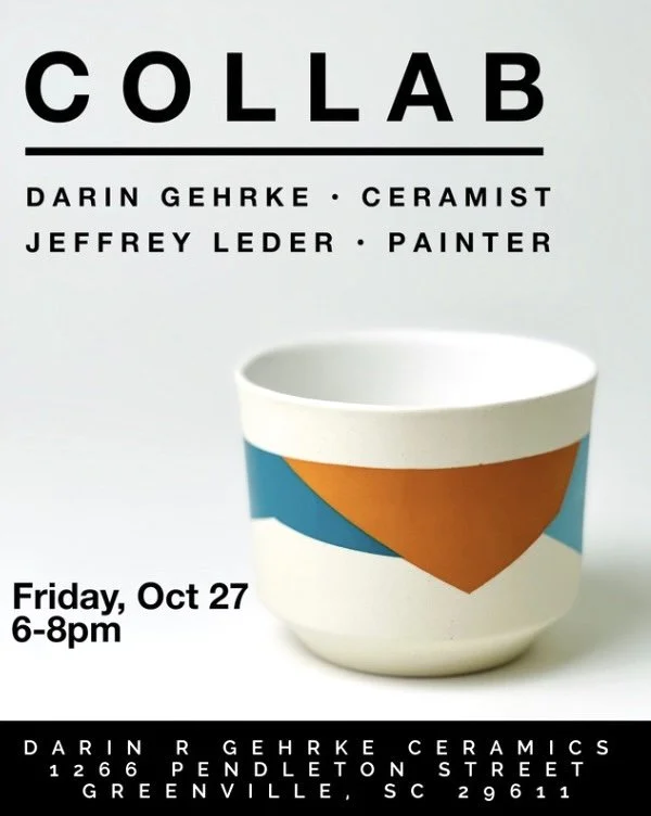Greenville artists Darin Gehrke and Jeffrey Leder have combined techniques to create a group of one-of-a-kind, handmade ceramic pieces. Join us for an opening reception Friday, October 27th 6-8pm.